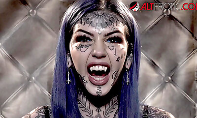 horny adult movie star dark-hued witwe in ultra-kinky piercing, tattoos lovemaking szene